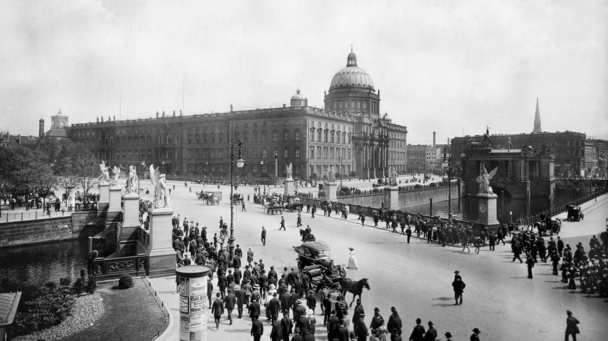 Het is 1903, de wandelaars lopen over de brug richting het Stadt-Schloss (en dragen allemaal een hoed!). Het enorme slot, sinds eeuwen het centrum van Berlijn vormend, zou vijftig jaar later tot de laatste steen afgebroken worden. Zwaar gehavend uit de oorlog gekomen, maar vooral symbool van Pruisische monarchie, de macht van koningen en keizers, was het de wens van de communistische regering van de DDR het te vervangen door een ander symbool, dat van de triomf van de heilstaat. De overblijfselen van het slot werden in 1950 opgeblazen. Het duurde tot 1971 toen Erich Honecker, de voorlaatste Oost Duitse leider, de opdracht gaf op die plek een Paleis voor het Volk te bouwen; het Palast der Republik. Dat werd na de val van muur, na de eenwording in 1989, onmiddellijk gesloten vanwege de grootste hoeveelheid asbest ooit aangetroffen in een gebouw in Europa. In 2010 was er ook van het Palast niets meer te zien. Op 12 juni 2013 werd de eerste steen gelegd van de wederopbouw van het barokke, monumentale slot.
