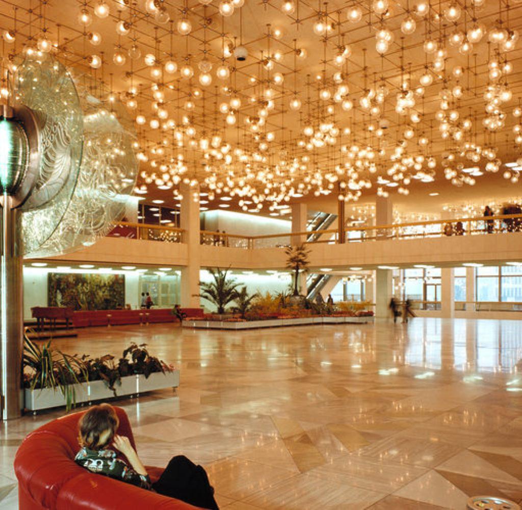 In addition to huge halls for party gatherings, there were also concert and theater halls, functioning telephone booths, a bowling alley, a rotating doormat, and tasty coffee to show the world that the people were well taken care of.
