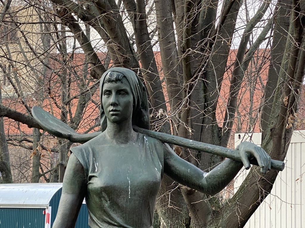 There had to be a feminine counterpart in front of the town hall; behind a fence I found her, with a shovel.