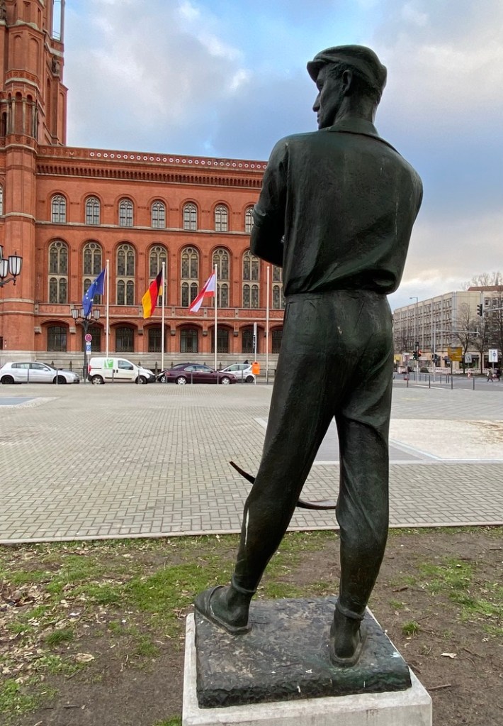 The study is located at the front of what is called ‘Das Rote Rathaus’. This man stands in front of that, a bit hushed in the bushes. Undoubtedly put down in the GDR era. Also a sculptural cliché, but I like it: steadfast, good head, rolling up his sleeves, with pickaxe.