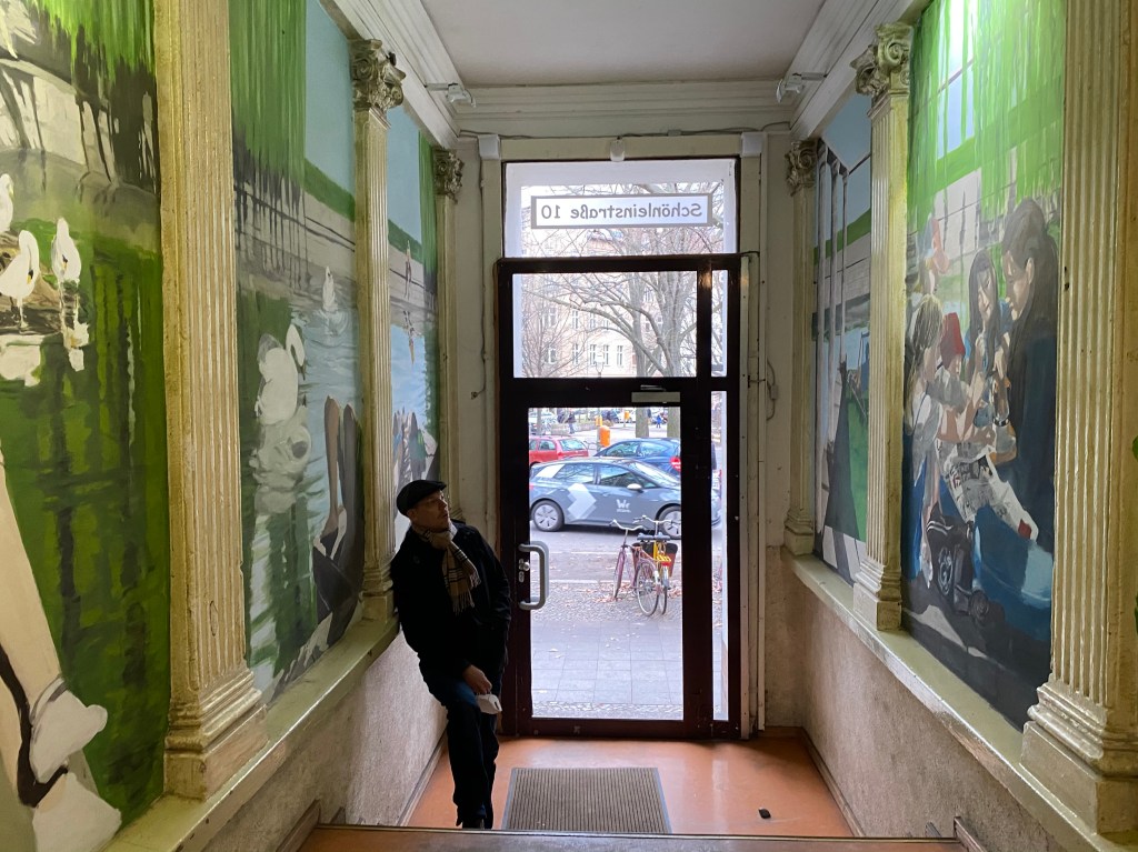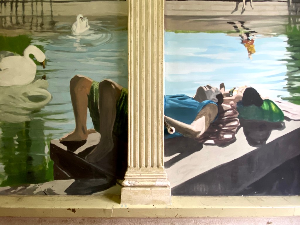 Maar als de verhoudingen kloppen en het onderwerp aansluit bij de plek en het een goeie schilder is dan kan het echt een verrassing zijn. Ik kende de hal van het huis van Max Diel, die ooit op de Rietveld studeerde, maar alweer 25 jaar aan de Schönleinstrasse in Kreuzberg woont. Hij heeft een aantal jaren geleden aan de huisbaas gevraagd of hij schilderingen aan mocht brengen op de wanden van de hal, die daarom vroegen. En nu vermoeden mensen die langskomen dat het originele voorstellingen zijn die bij de bouw van het huis aan het einde van de 19e eeuw geschilderd werden. Dat is niet zo gek, dat ze dat denken. Zoals Manet het onbezorgde leven kon schilderen, terloops bijna, een ontmoeting in het park, de zon sijpelend over de gezichten, onbekommerd als zomermiddagen kunnen zijn. Zo schilderde Max scènes uit zonovergoten Berlijn, in het park aan het water, met spiegelingen en zwanen en mensen die het er naar hun zin hebben. Met zijn kenmerkende aandacht voor schaduwen, slagschaduwen soms, die de kracht van de zon tonen. Taferelen zijn het waarnaar we mateloos kunnen verlangen.