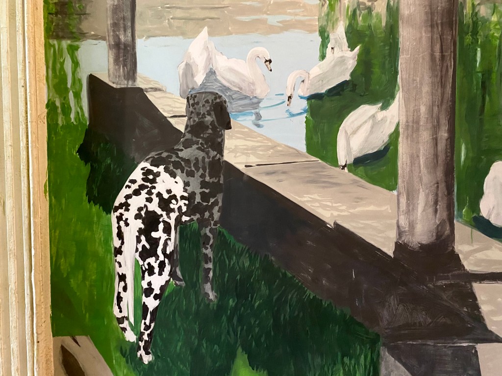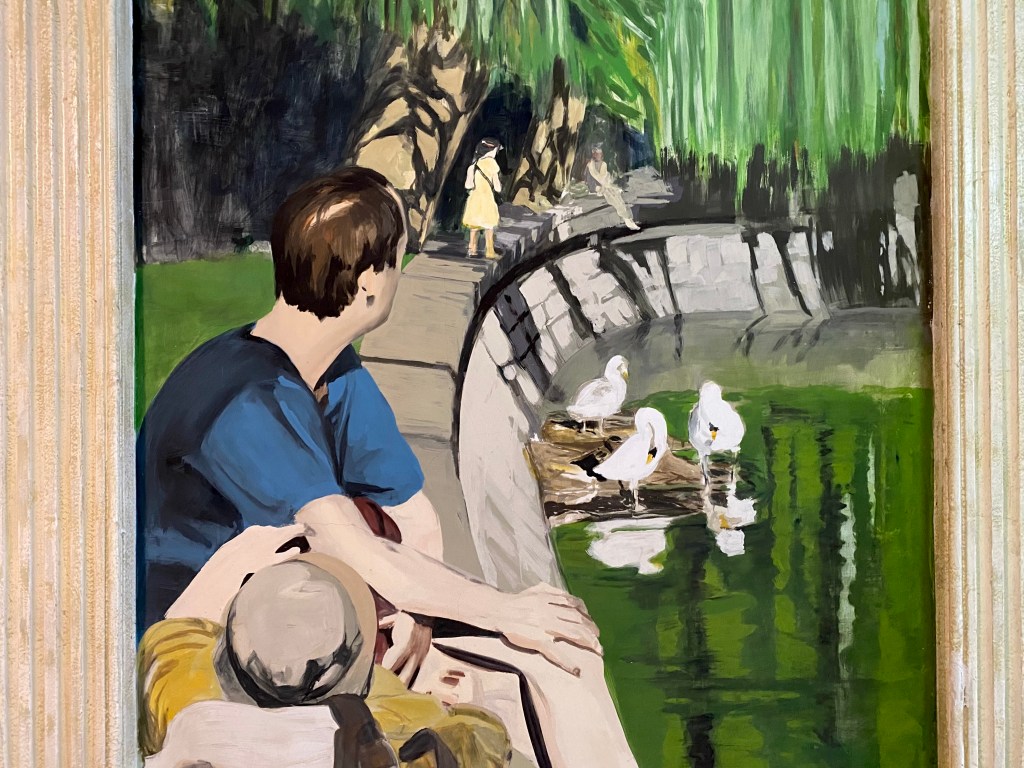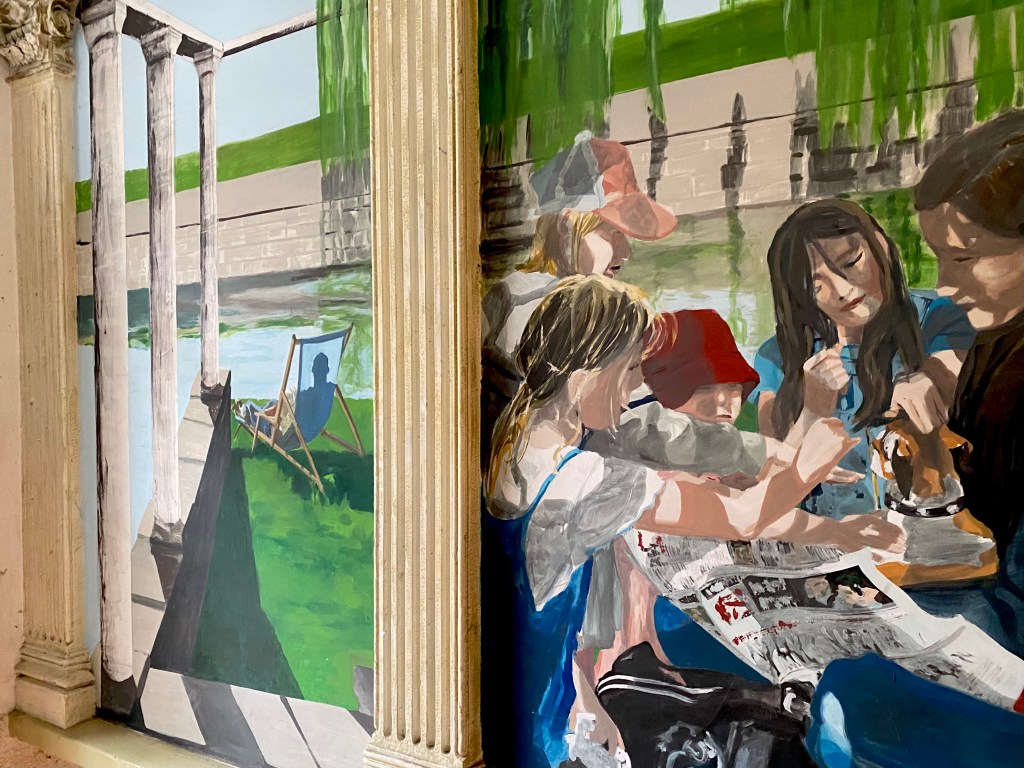 But if the proportions are correct and the subject matches the place and it is a good painter, then it can really be a surprise. I knew the hall of the house of Max Diel, who once studied at the Rietveld, but has lived on the Schönleinstrasse in Kreuzberg for 25 years. A few years ago he asked the landlord if he could apply paintings to the walls of the hall, who so requested. And now people who pass by suspect that these are original pictures painted during the construction of the house at the end of the 19th century. That is not surprising that they think so. Just as Manet could paint the carefree life, almost casually, a meeting in the park, the sun seeping over faces, carefree as summer afternoons can be. Max painted scenes from sun-drenched Berlin, in the park by the water, with reflections and swans and people having a good time there. With his signature attention to shadows, sometimes drop shadows, showing the power of the sun.