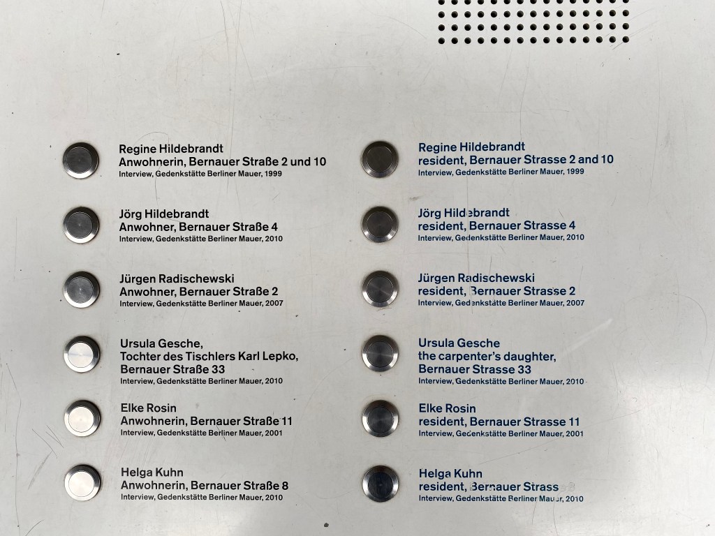 Well prepared, the building continued that night and the Berlin population woke up with a wall in the middle of the city. Front doors and windows on the west side were bricked up. Visiting your neighbors across the street was a subversive act and life-threatening from that point on. The Bernauerstrasse, one of the streets through which the wall went straight, is now a ‘Denkmal’ and in a reconstruction of a shop that had to give way, there is a panel with audio fragments where you can listen to the ‘Zeitzeugen’. Under one of the buttons, a woman tells how every Sunday afternoon they were allowed to make use of a neighbors’ living room that was on the wall side, to see their sick father on the other side of the wall. Waving was not possible, waving was illegal, so every Sunday from four to four-thirty they stroked their hair and stared at each other.