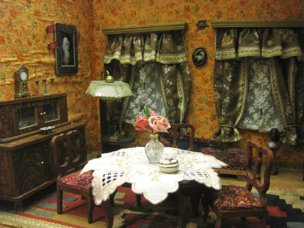 Dit is de woonkamer in het poppenhuis dat eind jaren ’30 gemaakt is voor een lid van de Hitlerjugend, waar vanaf 1940 alle jongeren ouder dan tien jaar verplicht lid van moesten zijn. Het is hier in Berlijn te zien in het Historisches Museum, denk ik. Want ik kan de foto ook gemaakt hebben in Bonn, in het Haus der Geschichte. Dat wilde ik uitzoeken en het dit keer in zijn geheel fotograferen. Want er was ook een heel enge slaapkamer, herinner ik me.