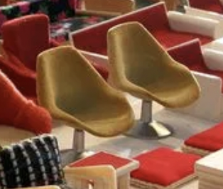 Fortunately, my sister got one in the late ’60s. It wasn’t that pretty, with plastic furnishings and the exact same ocher-colored bucket seats that are to be seen in the top photo. Lots of things that did not fit together. These chairs, for example, were far too high for the sofa we had thought of them for.