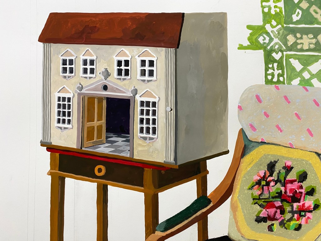 Deze week heb ik het poppenhuis geschilderd, dat Goethe kreeg op zijn vijfde verjaardag, naar een tekening van het huis dat ik op internet vond. Hij noemde het later in zijn dagboeken een belangrijk en invloedrijk cadeau. Het gaat allemaal deel uitmaken van een groot werk over zijn slaapkamer, zoals ik die ooit zag in zijn woonhuis in Weimar. Een fantastisch huis waar zijn hele kleurenleer op de verschillende wanden vertegenwoordigd is!