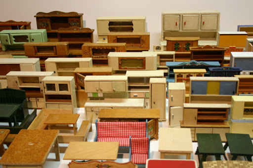 Honderden foto’s moeten er in mijn computer zitten van alle poppenhuizen die ik in mijn leven tegengekomen ben. Met al die nét niet kloppende verhoudingen, stoelen aangevuld met zelf geknutselde tafeltjes, planten van propjes crêpe papier en iets te grote schilderijtjes aan de muur. Met textiel gaat het vooral mis, daar verraadt zich dat het om een poppenhuis gaat, hoe nauwgezet de rest ook het echte interieur probeert te kopiëren. De dikke vouwen in gordijnen of in de dekentjes op het bed. We hadden ook een fornuis met blokjes in een houdertje die je aan kon steken om echte pannenkoeken te bakken in een mini-pannetje. Maar dat fornuis was natuurlijk te groot voor het poppenhuis.