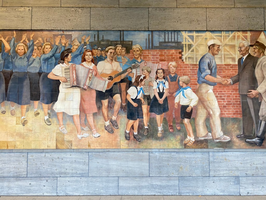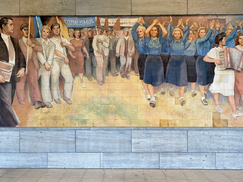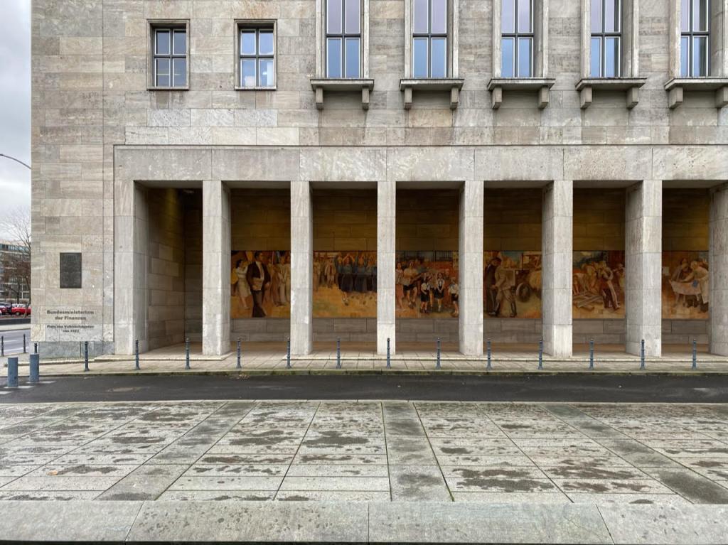 After the Fall of the wall, the building was once again given a governmental purpose: the Ministry of Finance is in it, but the tile tableau from the GDR period can remain. It was recently refurbished and looks just as it did in 1952.