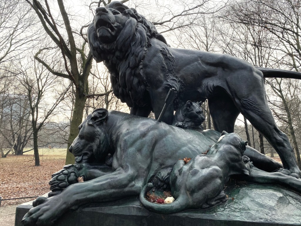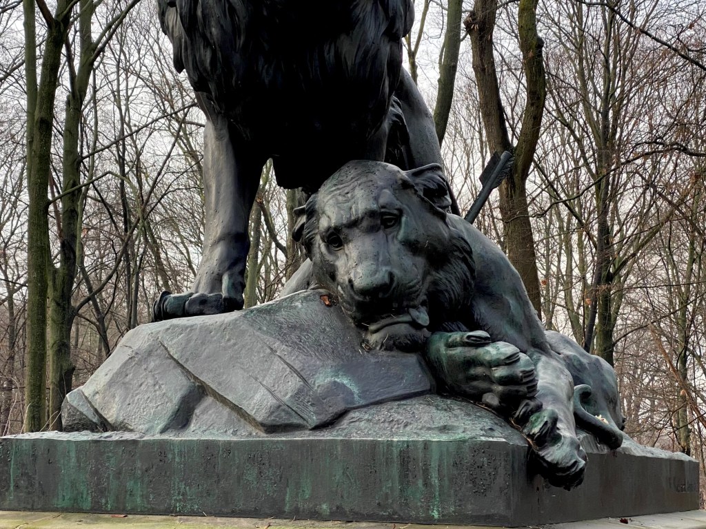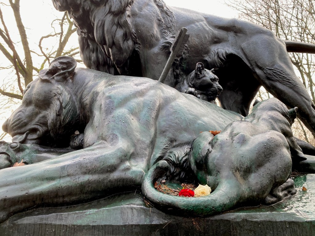 This family will always remain. Almost 150 years ago, in 1872, the statue was made, two years later cast in bronze and placed on a sandstone plinth in Tiergarten. It’s a tragic performance; the lioness has just been shot with an arrow and wounded, tongue out, a defeated look, the lion roars, and two young ones frolic around her, one of which tries to drink some more. I purposely cycled there twice because I find this a moving and fantastic piece. It is one of the last works by Wilhelm Wolff, who specialized in animal sculpture with his brother Albert. Wilhelm I, who had just been crowned Emperor of Germany, bought it and immediately had it placed in the publicly accessible park that was then still royal property.