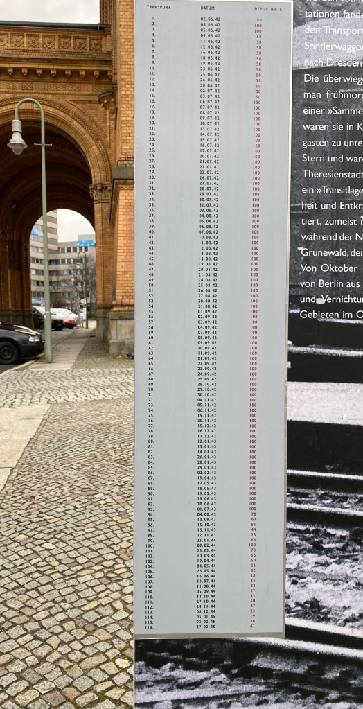 Elke morgen vertrok van perron 1 van Anhalter Bahnhof om 06.07 een trein naar Praag. Jarenlang, vanaf 2 juni 1942, werden aan die gewone personentrein twee extra wagons derde klasse gekoppeld. Daarin pasten precies 100 mensen, die ‘s morgens in alle vroegte met vrachtwagens naar het station waren gebracht. Ze stapten uit in het tussenstation Theresiënstadt en werden vandaar verder vervoerd naar Auschwitz, waar ze vermoord werden.