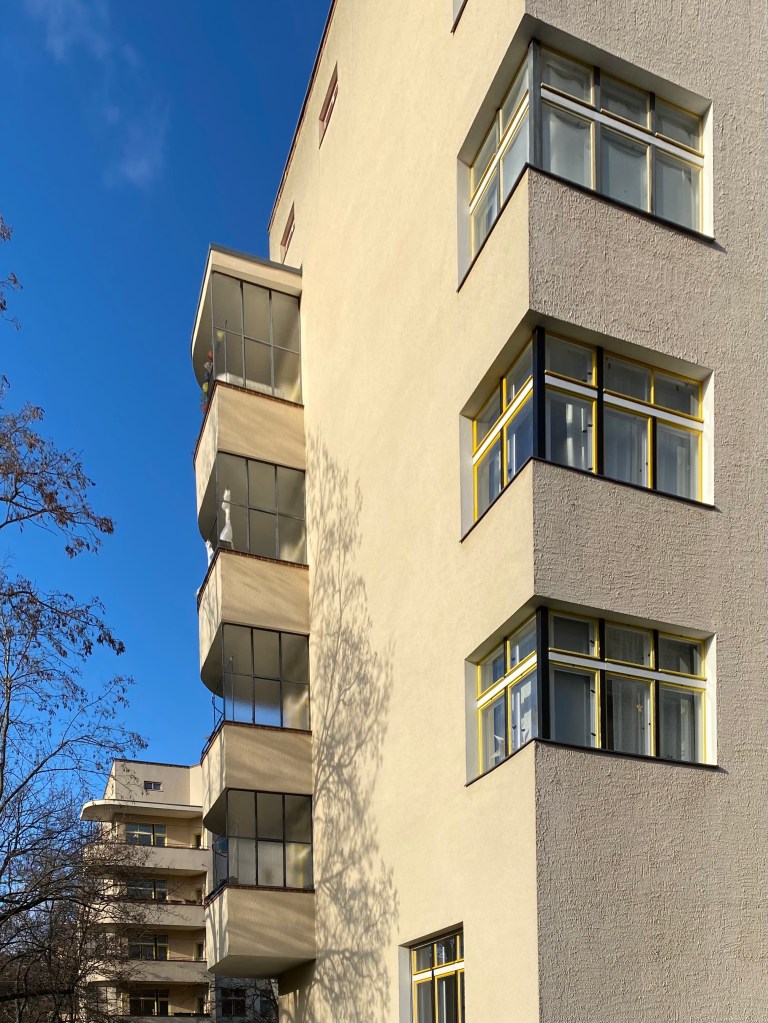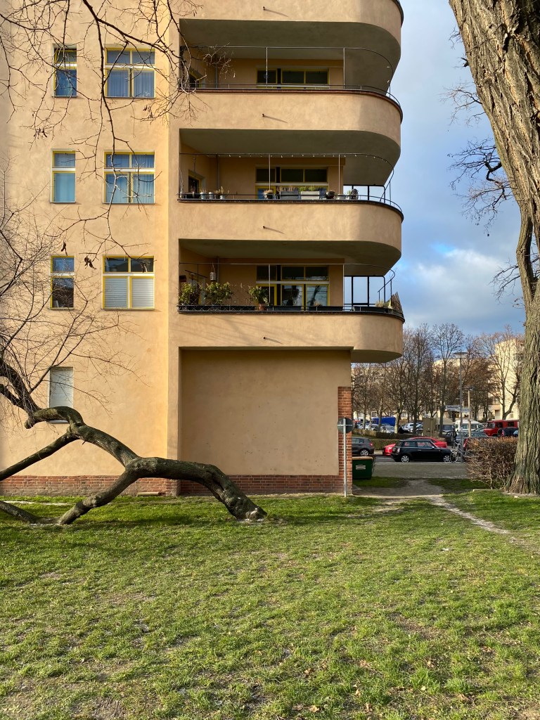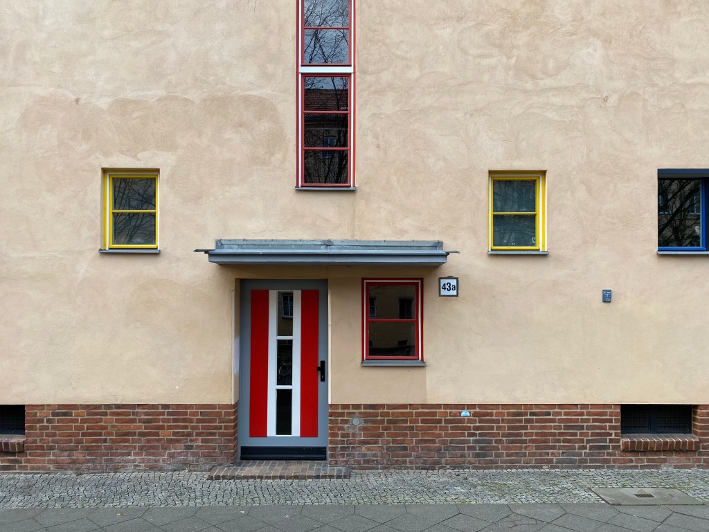 This entire block was named after the social democrat who at the time had campaigned for social housing with character, Carl Legien. The different streets were given the names of the social-democratic leaders of the time. Of course, that had to change immediately when the Nazis came to power. They turned the street names into the names of the Flemish battlefields from the First World War. Immediately after 1945, they were replaced by the names of communist resistance heroes (a Soviet district!). The flats fell into disrepair, after the fall of the wall everyone painted their own color on the door, the balconies were converted into an extra room, but everything has been restored and brought back to its original 1930s situation. A feast to walk through it, everything is in balance. There is a lot more from Bruno and his brother Max Taut, for next time.