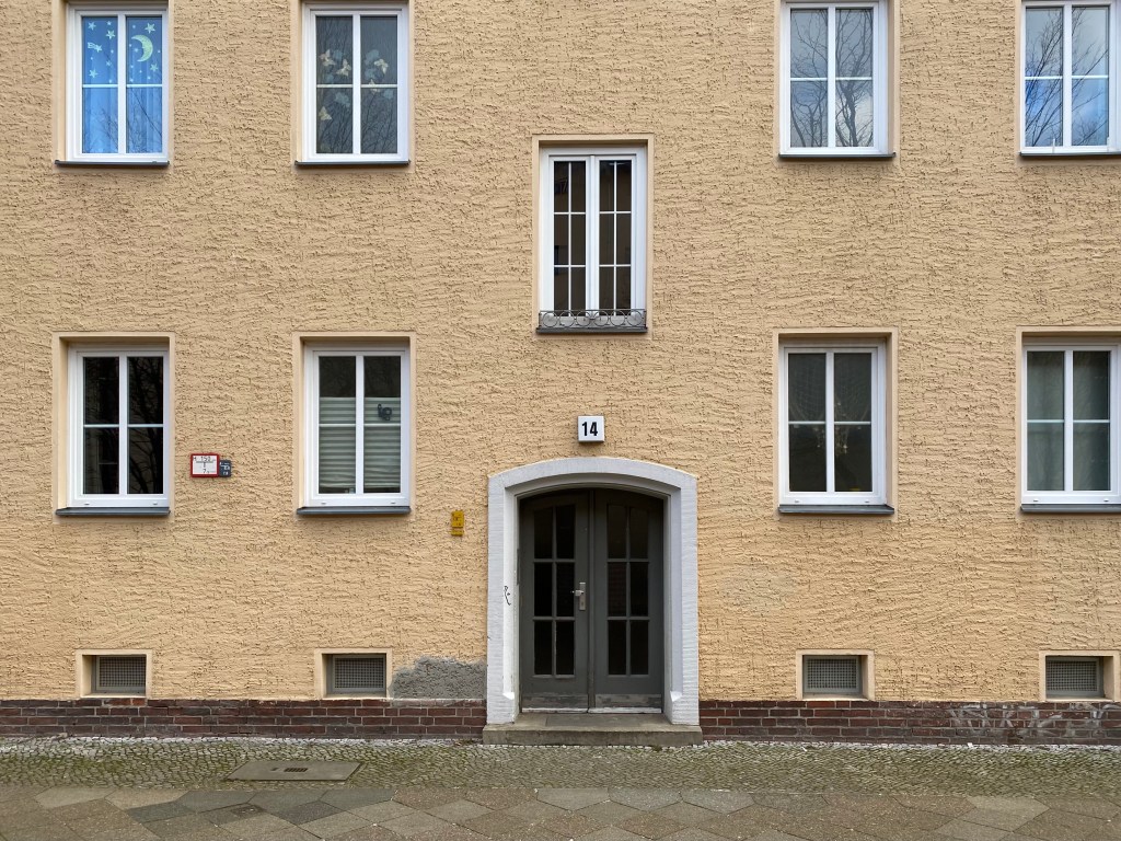 Neat, this entrance, there are many like this and there is not much wrong with it, but boring. The windows of the stairwell are distinct, otherwise, everything is the same. Covered in a thick German plaster layer. The house number, the black 14 on a white lightbox, is practical, because that way all houses are numbered in the former East and I always know – cycling through the city – where I am, East or West and where the wall was.