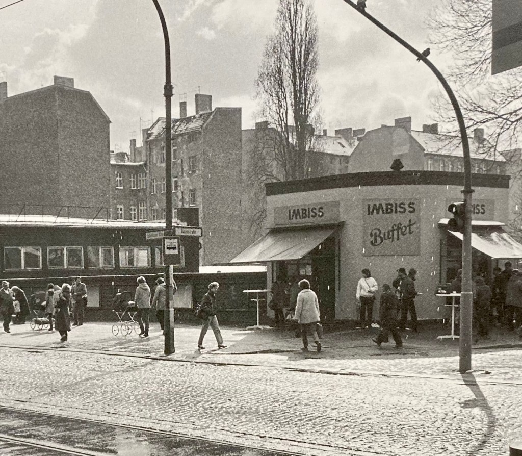 In een boek over Prenzlauer Berg zag ik een foto van dezelfde hoek, de snackbar die in de DDR tijd nog Imbiss heette. Imbiss staat voor een snelle tussendoor-hap. Er zijn twee uitgifte-luiken en het wordt geafficheerd als ‘buffet’. Er is één verkeersbord: een pas op! aanduiding voor de tram die er aan kan komen.