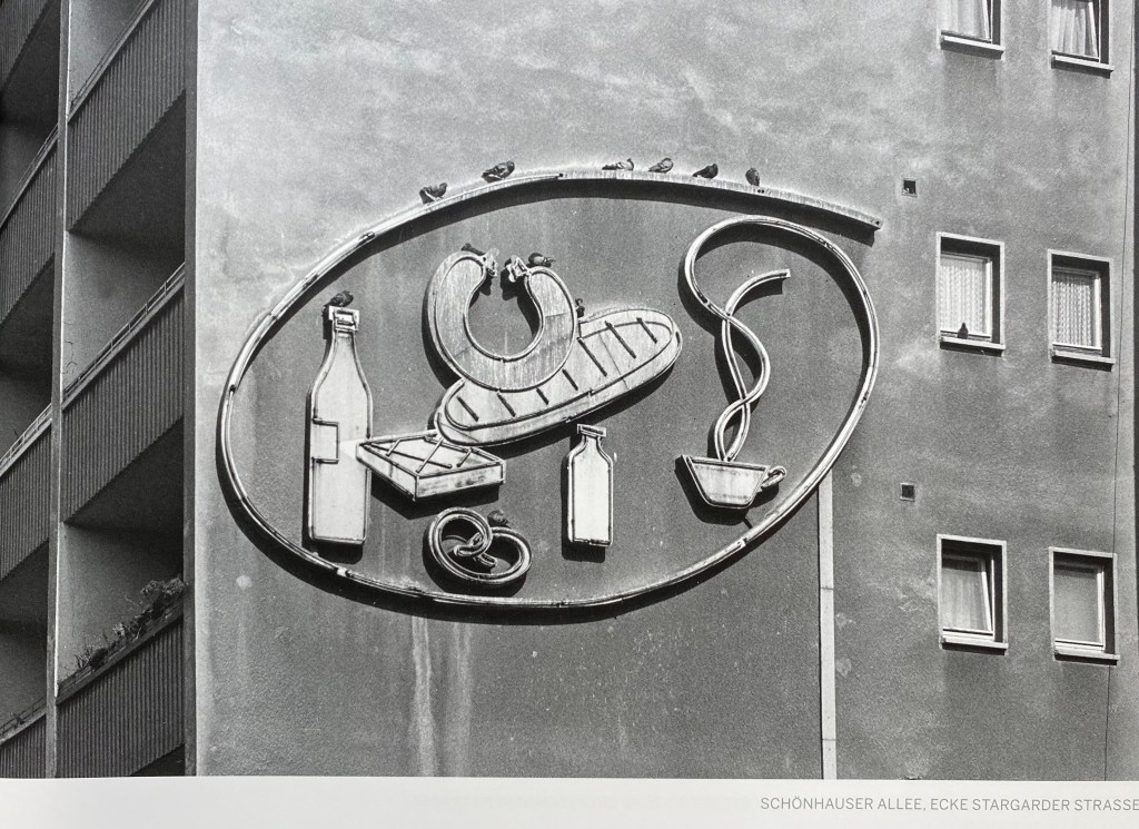 In the same book there was a photo of the apartment building diagonally opposite, on the Stargarderstrasse with a neon advertisement, without a product name, because advertising was not necessary in the GDR time, after all, the State took care of everything. With a sausage, a loaf of bread, a piece of cake, a pretzel and something to drink. What else do you want. And then it lit up in the evening, in a dark neighborhood where there was little else to do.