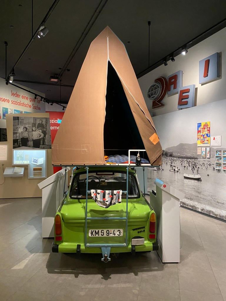 Op de tentoonstelling was een vrolijk filmpje te zien van een groot gezelschap Trabant-tent-bezitters die zich in een halve cirkel opstelden. Zoals je dat wel eens ziet met een groep camper-reizigers. Er werd een man geïnterviewd die Gerhard Müller heette en in de jaren ’70 patent had aangevraagd op zijn uitvinding, die hij in een loods in het dorpje Limbach fabriceerde. Hem werd gevraagd hoeveel kilo dat Trabant-dak kon hebben? Het was een drie-persoonstent, personen die er rechtop in konden staan mochten samen niet meer wegen dan 250 kilo!