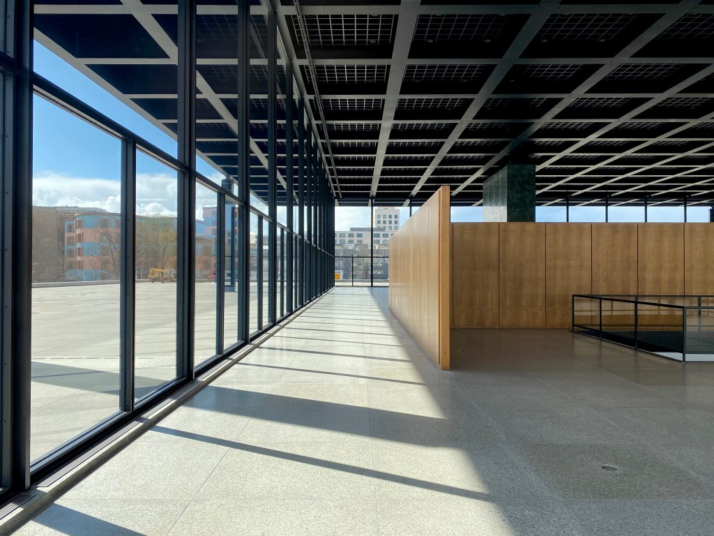 Vorige week fietste ik er ‘s nachts langs (je mag in Berlijn met maximaal twee personen naar buiten na 22.00 uur) en zag dat het gebouw helemaal vrij stond. Zoals Mies van der Rohe het op zijn tekentafel had staan, zoals je je voorstelt dat hij het model presenteerde aan de opdrachtgevers, zo stond ik er voor. Het was zijn laatste gebouw en werd in 1968, een paar maanden voor zijn dood, opgeleverd.