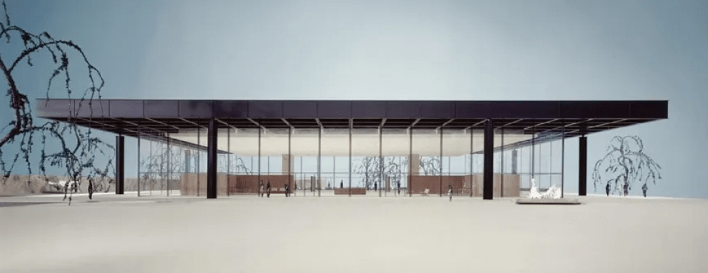 Mies van der Rohe bouwde voor de Wereldtentoonstelling van 1929 in Barcelona het Duitse paviljoen, dat -zoals de meeste paviljoens in wereldtentoonstellingen- meteen na sluiting weer werd afgebroken. Men realiseerde zich gaandeweg dat het een belangrijk sleutelwerk was in zijn oeuvre en besloot het in 1986 zo nauwgezet mogelijk te herbouwen. Anders van afmetingen en verhoudingen, maar niet ver afstaand van wat hij veertig jaar later voor Berlijn ontwerpen zou.