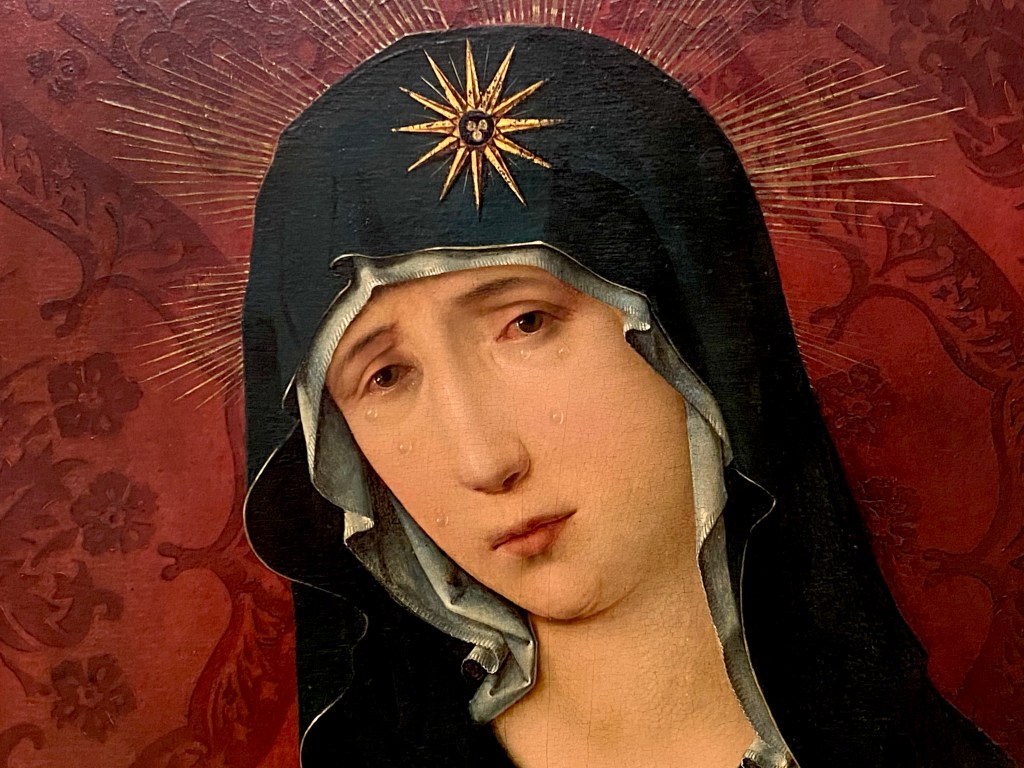 Het echte verdriet komt pas als Jezus aan het kruis hangt, en in de pietá met het dode lichaam van haar zoon in haar schoot. Dan heeft ze rode ogen van het huilen, of ziet net zo bleek als hij. Ik weet dat ik voor de eerste keer de enorme kracht van de Maria verering zag, toen ik op reis was in Guatemala en daar in een dorpskerk een kleine Indiaanse vrouw schokschouderend verdriet zag hebben, geknield opkijkend naar het beeld van Maria, dat haar door glazen tranen aankeek. Maria, die haar begreep.