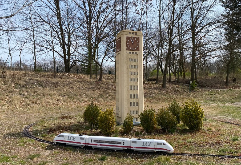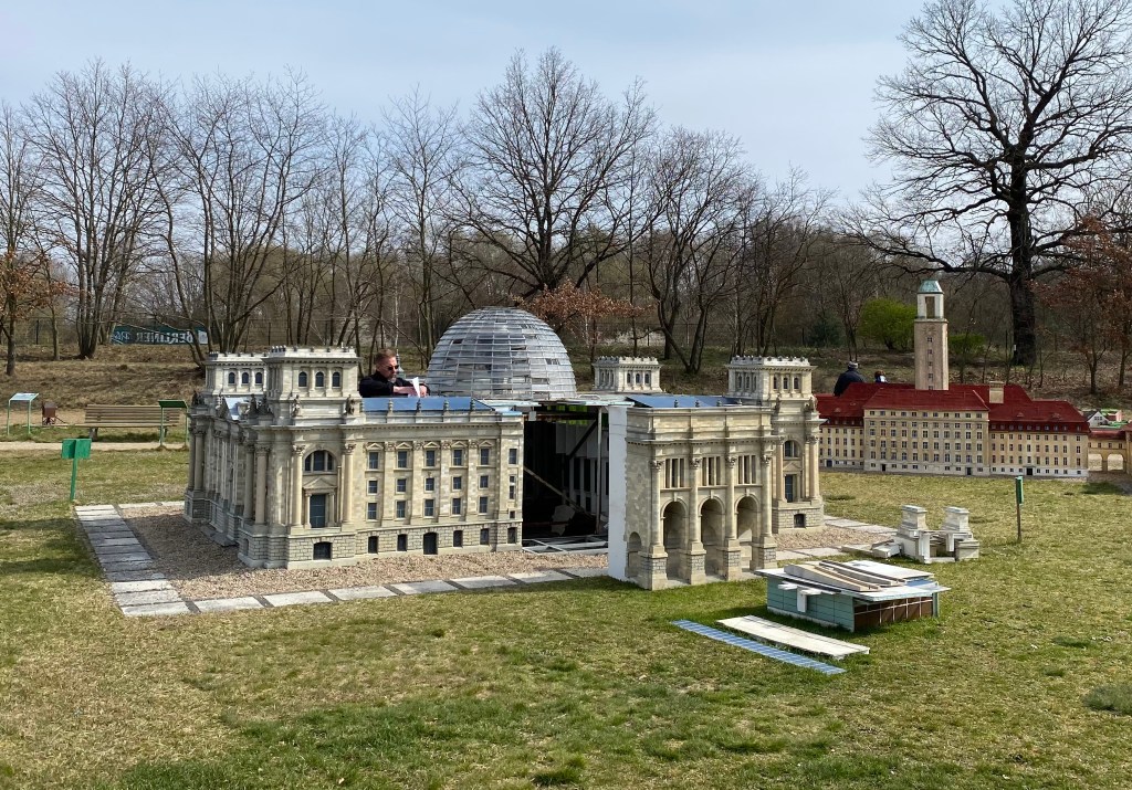 Modellpark Berlin heet het, een soort Madurodam, maar eenvoudiger, met een rek ansichtkaarten en een tentje waar ze curryworst verkopen. Jammergenoeg niet hele kleine, niet op schaal. Er moet voortdurend en flink opgeknapt worden, verzekerde de meneer me die middenin de Rijksdag stond om de schade van de laatste storm op te nemen. Maar het is goed gedaan, met hier en daar een knop die werkt. Bachs orgelmuziek uit de kerktoren, en geluid van joelend publiek bij het stadion. Het is een project als sociale werkplaats waar mensen met een handicap hun bijdrage leveren. Het is een beetje onderkomen, nogal wat torens zijn afgebroken en vogels zijn op balkonnetjes gaan zitten die dat niet overleefden. Er was ook geen totaalplan-van-aanpak, de panden zijn uitgestrooid over het terrein, naast veel te hoog geworden struiken. Maar dat maakt het allemaal juist zo charmant.