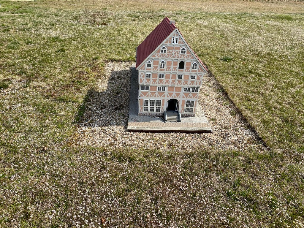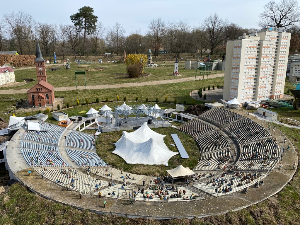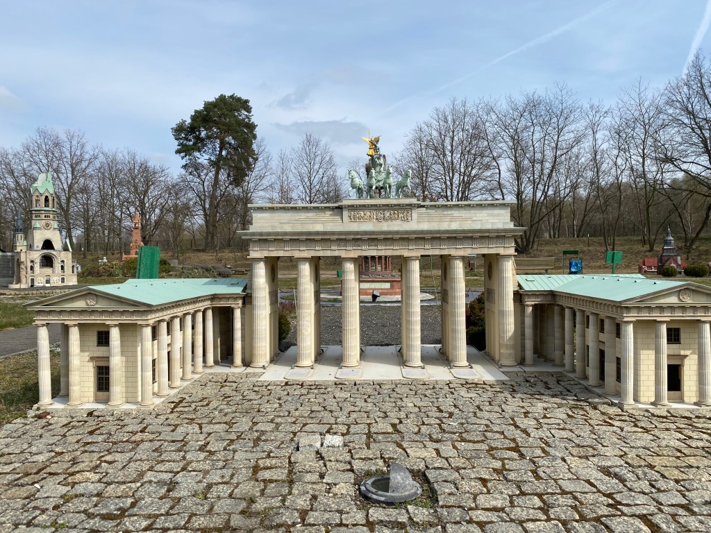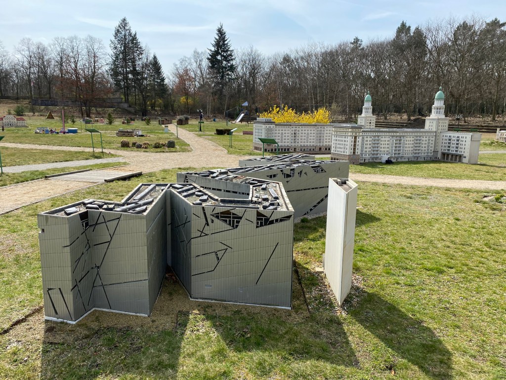 It is called Modellpark Berlin, a kind of Madurodam, -the tiny version of the Netherlands in the Hague-, but simpler with a rack of postcards and a tent where they sell currywurst. Unfortunately not very small, not to scale. There is a need for continuous and substantial refurbishment, assured me the gentleman standing in the middle of the Reichstag to assess the damage from the latest storm. But it’s done well, with a button here and there that works. Bach’s organ music from the church tower, and the sound of a screaming audience at the stadium. It is a project as a sheltered workplace where people with disabilities make their contribution. It is a bit shabby, quite a few towers have been demolished and birds have settled on balconies that did not survive. There was also no plan-of-action, the buildings were scattered over the site, next to bushes that have grown too high. But that’s what makes it all so charming.