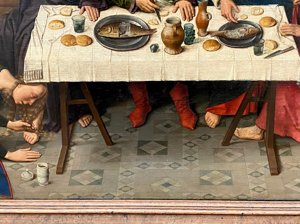 Unfortunately in mine not that endearing Mary Magdalene for whom the tablecloth is slightly turned. She dries the feet of Jesus with her hair, after washing them with her tears and later anointing them with the oil from the stone jar. But who knows.