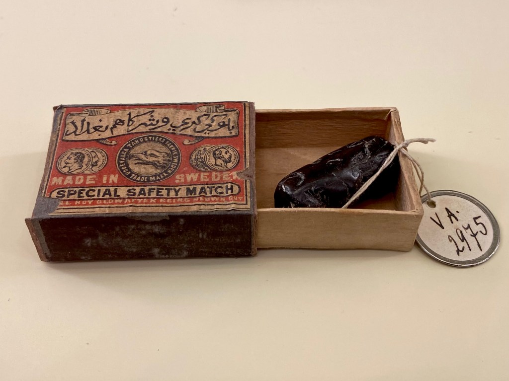 Dat nam Koldewey mee naar huis van zijn eerste reis, met daarin een soort gelukssteentje. Hij moet de lucifers daar gekocht hebben, getuige het opschrift. Maar hadden ze in 1897 al luciferdoosjes in Babylon. Made in Sweden? ‘Will not glow after being thrown out’?
