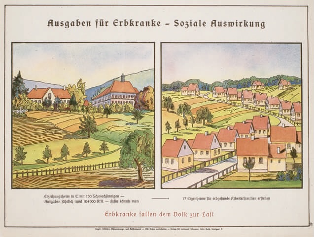 ‘Mensen met een erfelijke ziekte zijn het volk een last’ staat onderaan deze bladzijde in een geïllustreerd schoolboekje uit 1939, met sommen voor de rekenles. Hierin wordt inzichtelijk gemaakt wat de gevolgen zijn van de hoge kosten die een erfelijk zieke met zich meebrengt. In dit voorbeeld gaat het om 150 ‘zwakzinnigen’ in een instelling die jaarlijks 104.000 Reichsmark kosten. Van dat bedrag kunnen 17 huizen gebouwd worden voor 17 gezonde arbeidersfamilies. Dat staat er, in een schoolboekje voor kinderen.