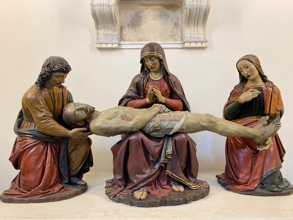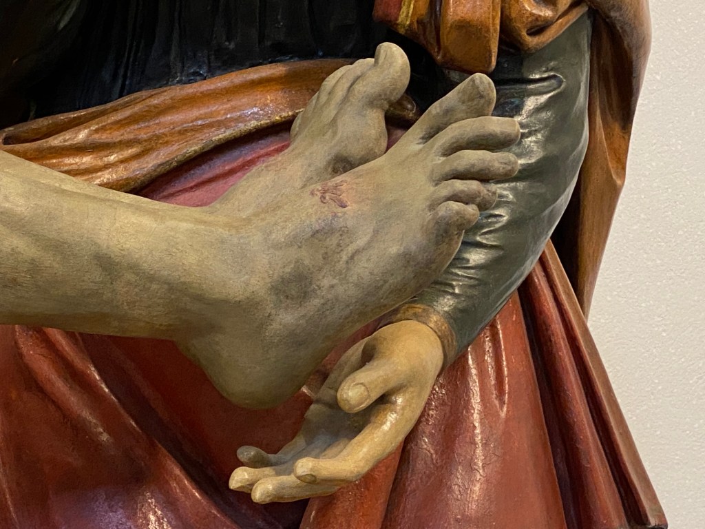The dead Jesus on Mary’s lap is surrounded by his most beloved Apostle John and Mary Magdalene, with their tearful faces. You often see that. But what I never saw before is that Jesus seemed to float. You don’t touch what is sacred. I could not get close enough to see if the body of Christ also touched Mary’s womb, her hands are folded and stay away from the cold, stiff body. His right arm is also just above her knee. The hands of Mary Magdalene and John follow the shapes, but keep their distance. I saw another wooden sculpture, of Riemenschneider, where Saint Luke does not touch his newly written gospel, there is a piece of his mantle deliberately between the book and his hand.`