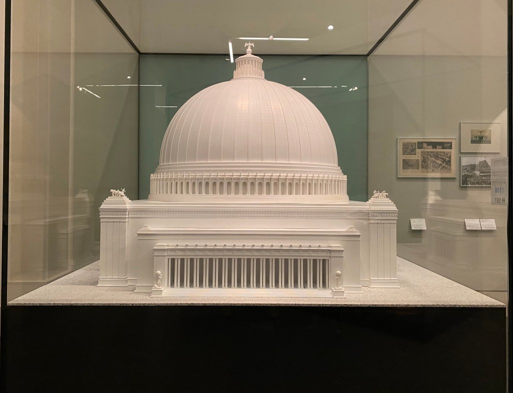 This is a model of the Grosse Halle des Volkes as designed by Albert Speer, commissioned by Hitler in 1938, which I just looked at last week in the Deutsches Historisches Museum. It is the most megalomaniac part of the center of Germania, the Welthaupstadt, for which Berlin districts were demolished before the war and should have been completed in 1950. With a height of 290 meters and space for 180,000 visitors, St. Peter’s would have dwarfed. That was the idea.