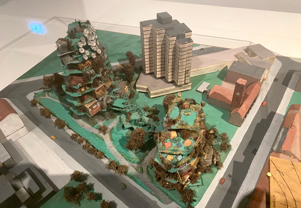 So, no, not extensively about that enormous exhibition in which the Berlin architecture of the eighties is highlighted, but just this model. Stacked eco houses with greenery on all levels, in front of the Askanischer Platz in Kreuzberg by Otto Frei from 1981, far before Winy Maas (MVRDV) invented them. The development of sustainable homes is not something that has happened in recent years: forty years ago Frei (the one of the roofs of the Olympic stadium in Munich) already thought of this for Berlin (nicht realisiert).