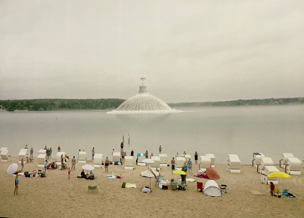 This is the most spectacular scene from the movie. Bathers enjoy themselves on the beach of the Wannsee, not far from the villa where the decision was made to deport and murder all Jews. Then from the water rises first the dome and then the whole Great Hall of the People of Germania, as designed by Speer, at which all the people stare in disbelief.
